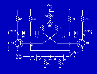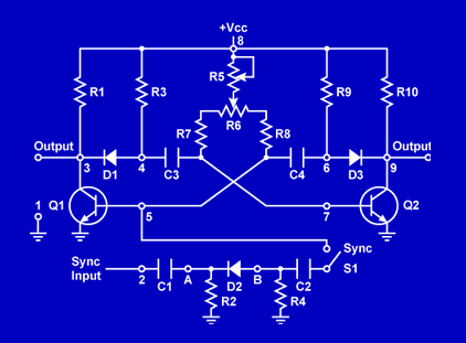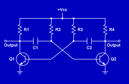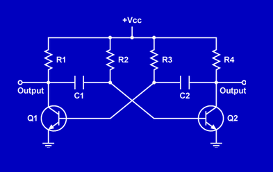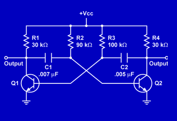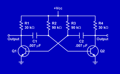 In this astable multivibrator, what components determine the frequency of the output square wave?