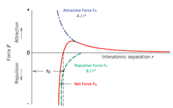 At large distances, atoms have very little interaction with each other, but as they approach, attraction and repulsion forces increase.