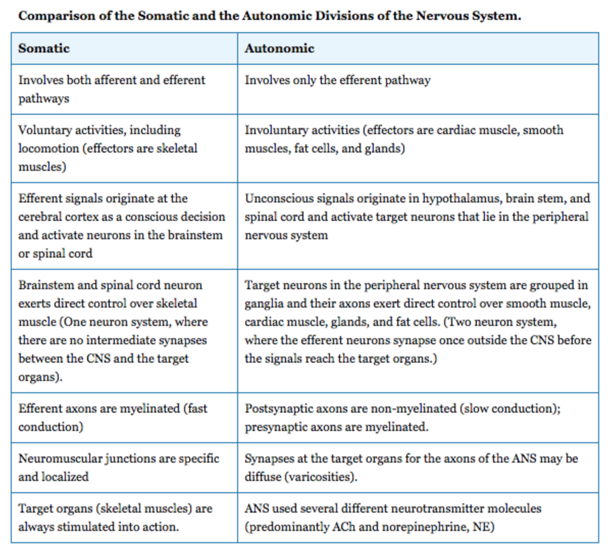 What does a diagram showing the differences between the autonomic and somatic nervous systems look like?