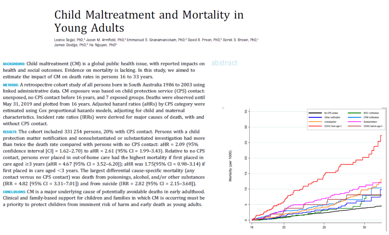 Hva konkluderte en studie med når det gjelder sammenhengen mellom barnemishandling og mortalitet hos unge voksne?