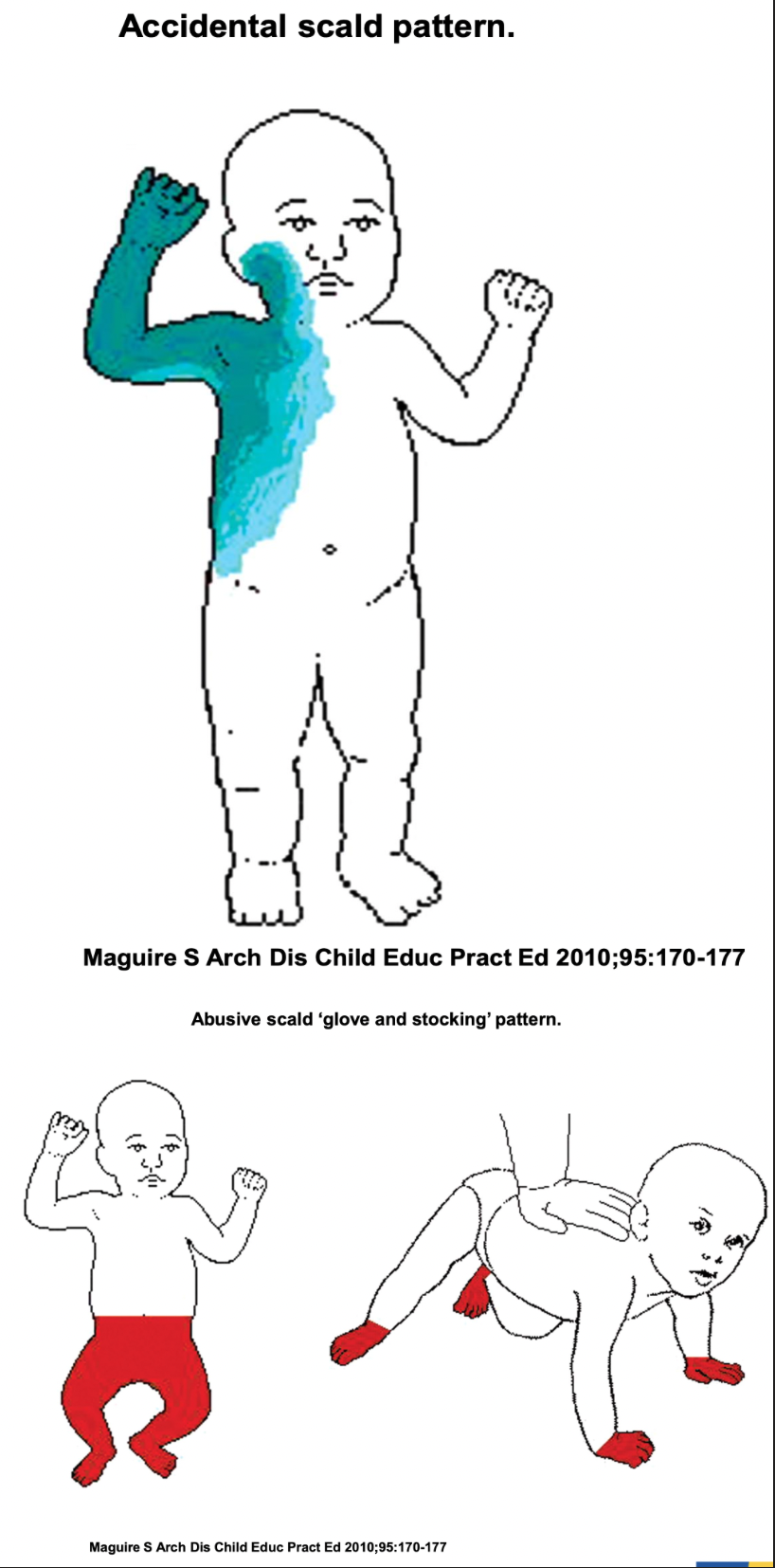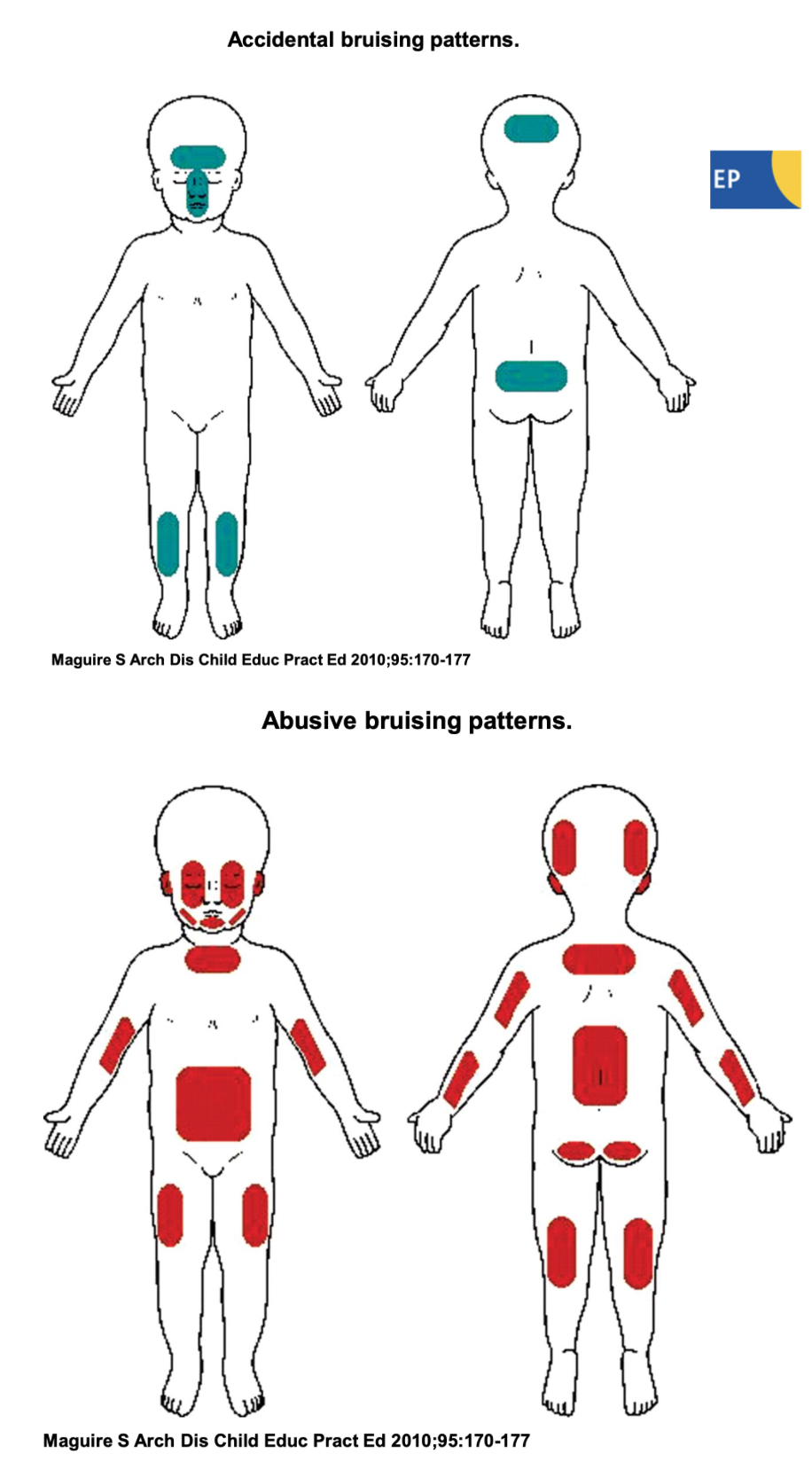 Hvilke skader er typiske for uhell/vold når det gjelder barn?