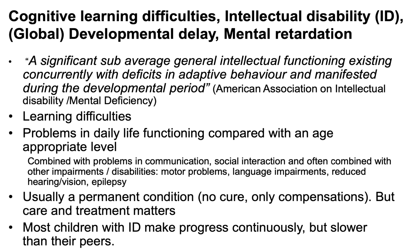 Hva kjennetegner kognitive lærevansker, intellektuell funksjonsnedsettelse, global utviklingsforsinkelse og mental retardasjon?