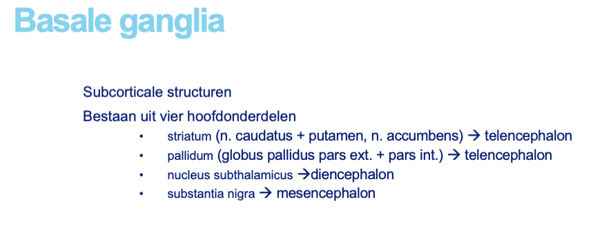 Waaruit bestaat basale ganglia (4) en waar liggen deze