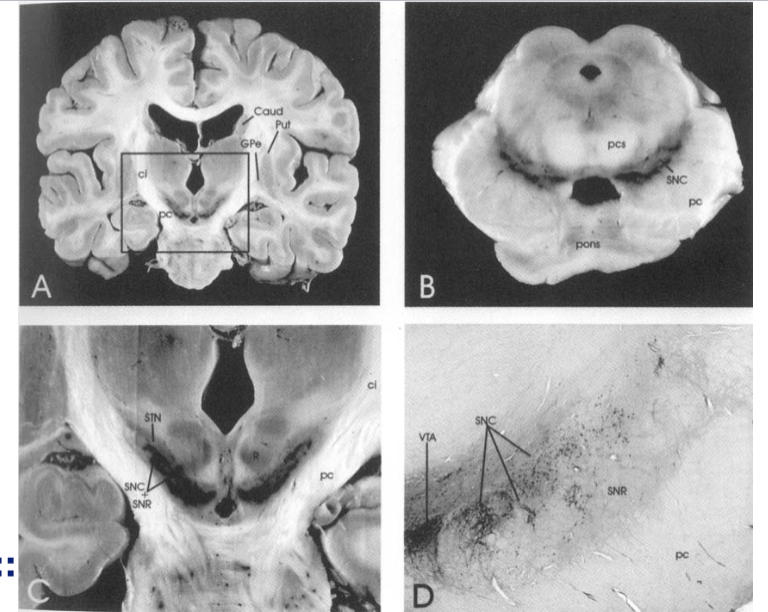 Hierbij is er degeneratie van dopaminerge neuronen en in SNC