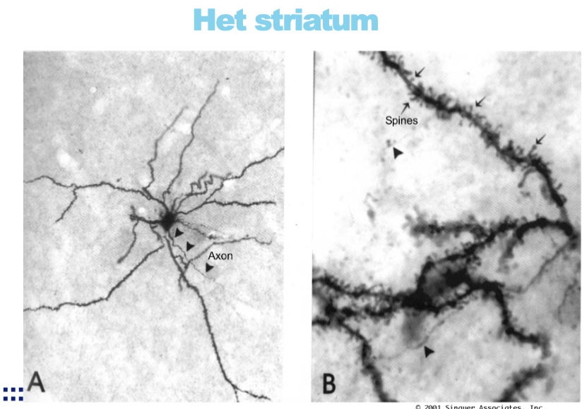 90% van alle cellen van het striatum (nucleus accubens, putamen en nucleus caudatus) zijn medium spiny neurons. Dit zijn projectiecellen, de axonen hiervan lopen naar een andere structuur. De dendrieten zitten vol met spines.