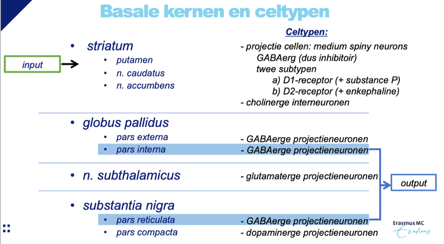 output van de neuronen gaat naar de globus pallidus (interna of externa) of naar de substantia nigra pars reticulata.