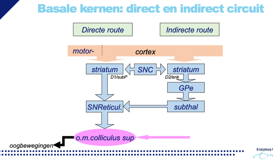 Indirect= d2–> externe globus pallidus –>subthalamicus