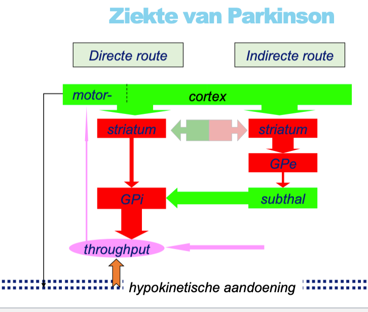 De globus pallidus internus –> motorische deel vd thalamus–> motorcortex. Thalamus krijgt ook info van cortex en cerebellum. De thalamus bepaald de hoeveelheid troughput ruchting de motorcortex (en piramidebaan). De GPi inhibeert de thalamus, dus dan minder info naar motorcortex.