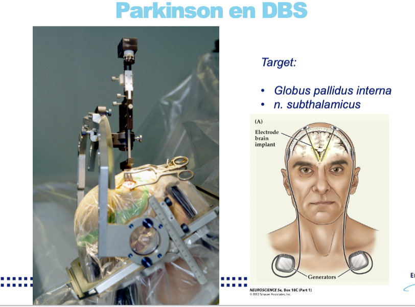 Elektrode op nucl. subthalamicus (hier het vaakst) of globus pallidus interna inbrengen en hiermee proberen situatie in evenwicht brengen. Door de stimulatie wordt het systeem platgelegd en wordt de indirecte route doorbroken, doordat de excitatie vd globus pallidus internus vermindert en zo verbetert de hypokinetische aandoening