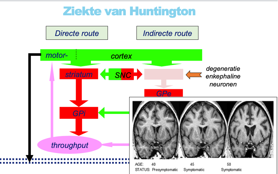 Degeneratie van d2 neuronen in het striatum. Dit heeft effect op de indirecte route waardoor de remming vd externe globus pallidus vervalt. Hierdoor wordt de nucleus subthalamicus juist extra geremd. Dit leidt tot minder stimulatie globus pallidus internus en een toename in de troughput. Dit leidt tot hyperkinesie: de chorea-achtige bewegingen, die karakteristiek zijn voor deze ziekte.
