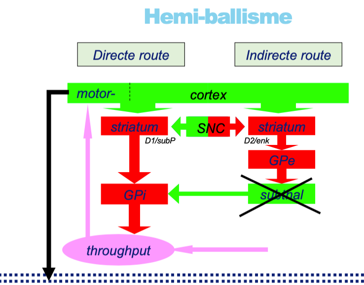 Hierbij valt de nucleus subthalamicus uit. Dit leidt tot minder stimulering van de remmende werking van de globus pallidus internus en een toename in de trouwghput. Hierdoor ontstaat ook weer hyperkinesie.