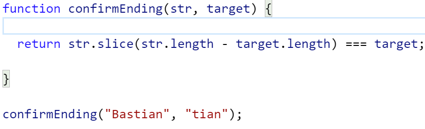 This challenge can be solved with the .endsWith() method, which was introduced in ES2015. But for the purpose of this challenge, we would like you to use one of the JavaScript substring methods instead.