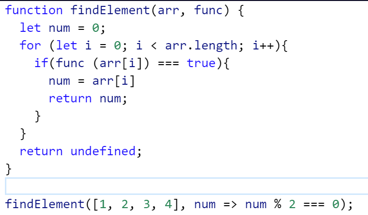 Create a function that looks through an array arr and returns the first element in it that passes a ‘truth test’. This means that given an element x, the ‘truth test’ is passed if func(x) is true. If no element passes the test, return undefined.