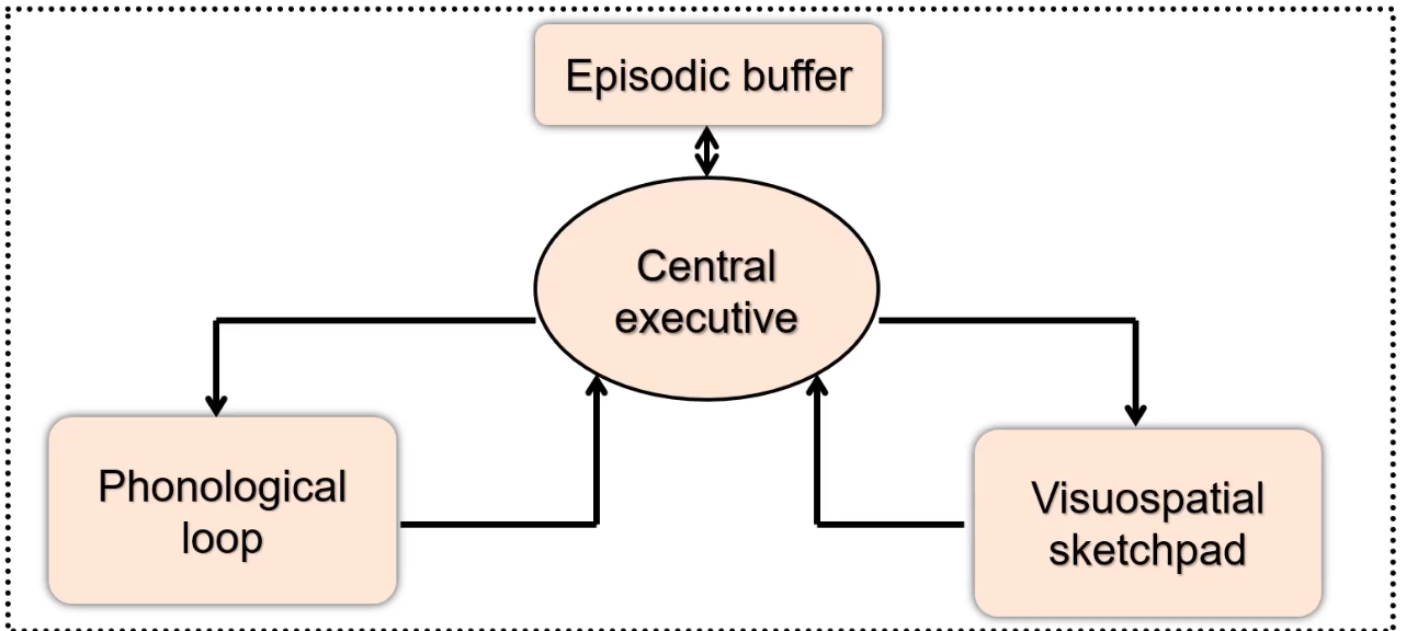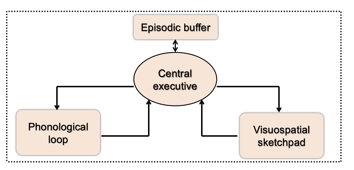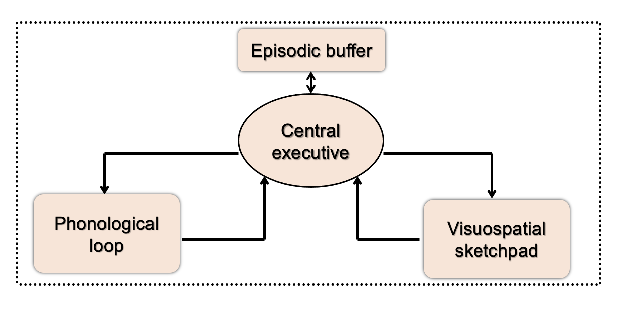 The working memory (short term memory) model (Baddeley & Hitch, 1974), which essentially is a model that shows how we are able to use working memory. It is important for reasoning, learning and comprehension. In working memory model the central executive is placed in the middle as in the image below, acting as a central boss. It is able to divert data to each other aspect of the model and is important for cognitive functions. What is the episodic buffer that was added to the model at a later state?