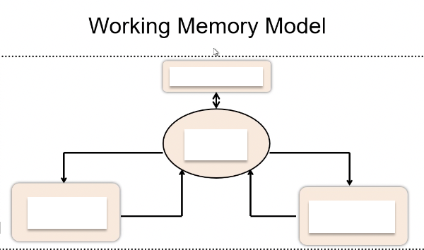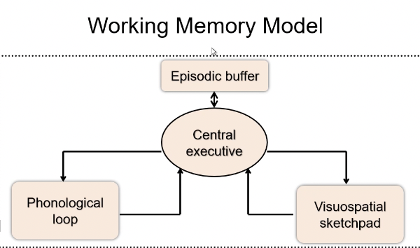 Subdivided into phonological store (holds words we hear)+ articulatory process/loop (allows us to repeat words in a loop/add meaning).