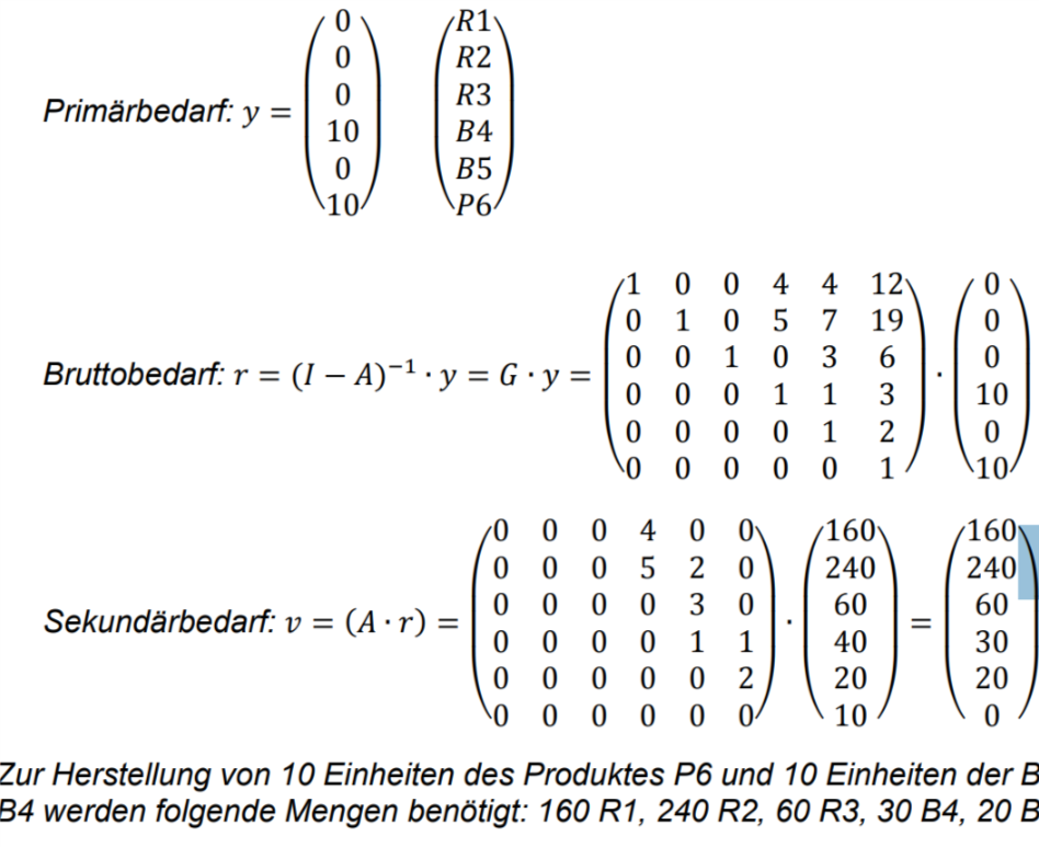 Wie berechnet man den Bruttobedarf und Sekundärbedarf bei gegebener Gesamtbedarfsmatrix? Worin liegt der Unterschied?