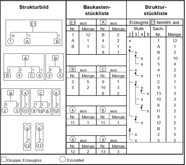 Nennen sie 3 Darstellungsarten von Erzeugnisstrukturen in der Praxis.
