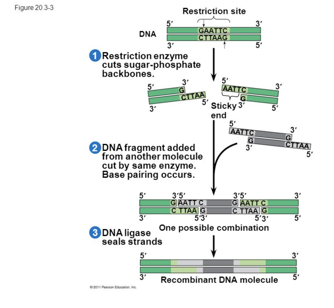 When you cut with restriction enzymes makes a jaggidy cut on green DNA, the grey dna source maybe cut out of another human genome, and that grey dna represents a gene for insulin or whatever* secret here is that the green dna or grey dna is cut with the same restriction enzymes they will have complimentary ssticky ends, they have potential then to hydrogen bond and stick together in teh way that is being shown with grey stuck in green areas** piee at bottom with some green and some grey is a piece of recombinant DNA***