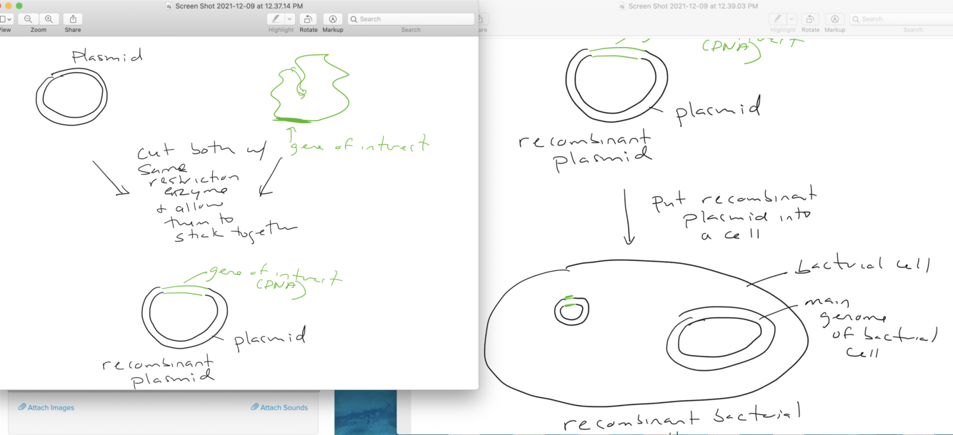 having a bacteria cell that has recombinant plasmid can be used to make a protein, would go great in a factory for humn insulin, if you had a bunch of these all day long they would pump out insulin; so now when you have this bacterial cell drawn here, part of its DNA besides its main chromosome of bacterium it also has this other loop of DNA inside of hte bacterial cell, the bacterial cell will express those genes also** so recombinant plasmid containing the gene for insulin we can say the cell will express this dna and make insulin* let bacteria divide and everything and replicates and then you have thousands of cells all with thsi recominant plasmid, the plasma that has the gene for human insulin. You can use the plasmid as a way for storing that extra dna for studying