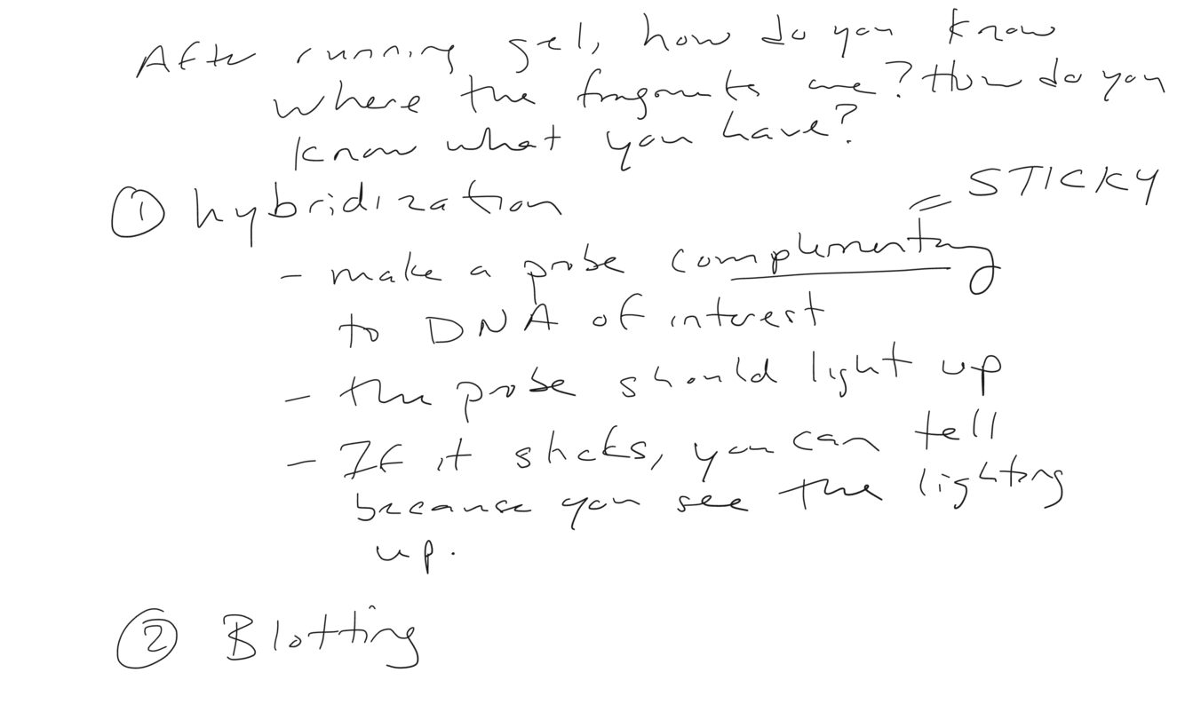 analyze with hybridization= other way you can tell, say you wanted to know more about what is in this DNA fragment, you can create a complimentary piece of DNA called a probe and wash it over the gel and see if it sticks* and if it sticks that means it is complimentary to what is on the gel and that means you knwo what sequence is on teh cell, so a way of using probe and technique of hybridization of what is on the gel*