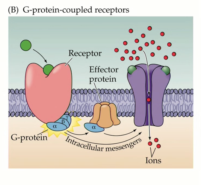 -Neurotransmitter also binds to these receptors, but instead of immediately opening an ion Channel, the step after binding is the activation of an intermediate protein known as the G protein
