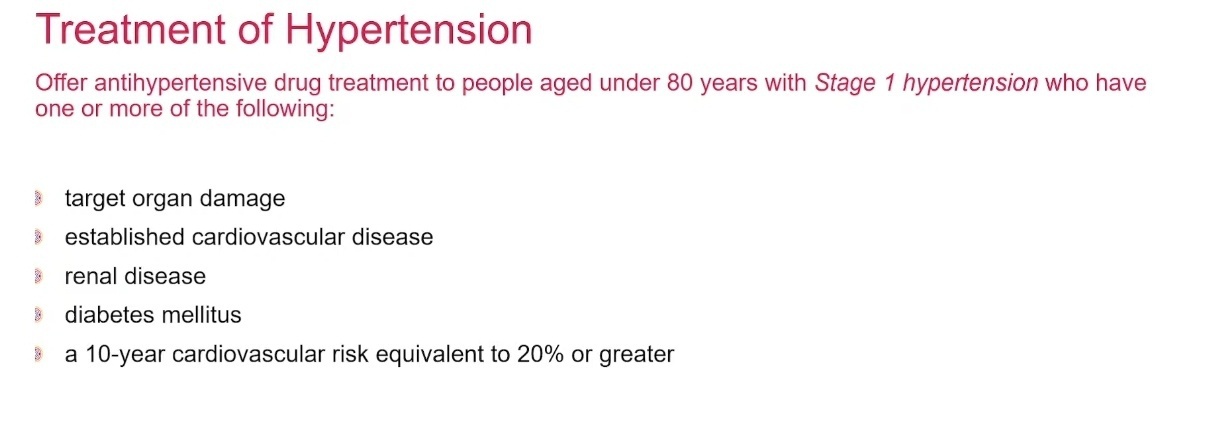Offer antihypertensive drug Tx to people aged 80 and under with stage 1 hypertension who have one or more of the following: