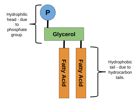 Describe the hydrophilic head and the hydrophobic tail of a phospholipid: