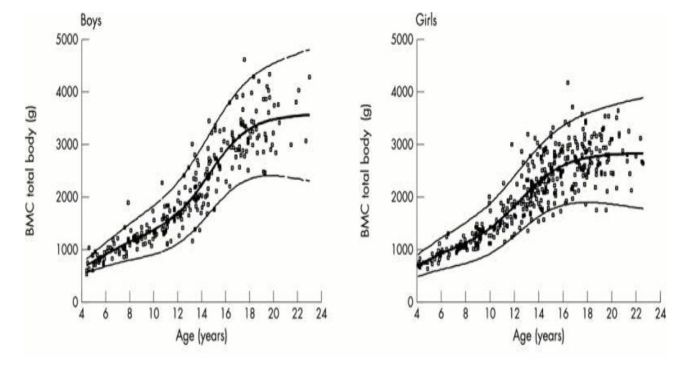 BMD increases but tapers at approximately the end of adolescence for boys and a bit sooner for girls