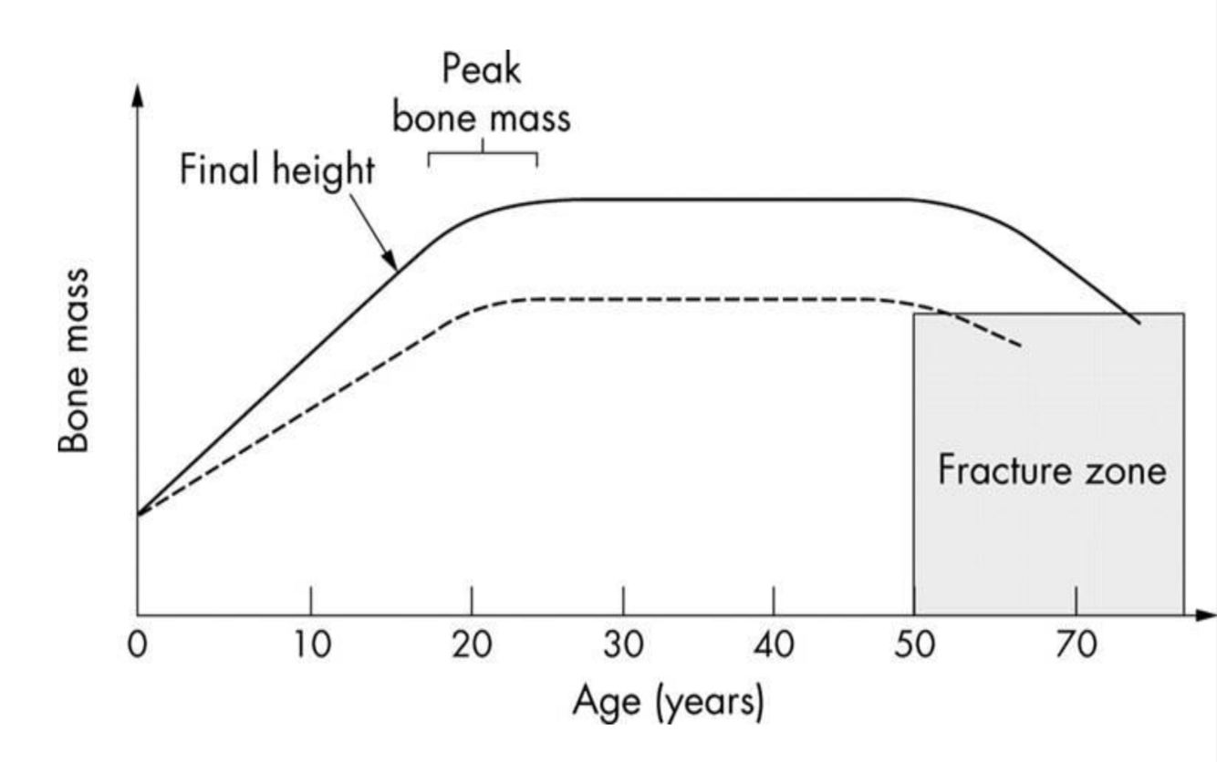 BMD peaks between 20-30 years of age and then begins to decrease (final height is reacher slightly before peak BMD)