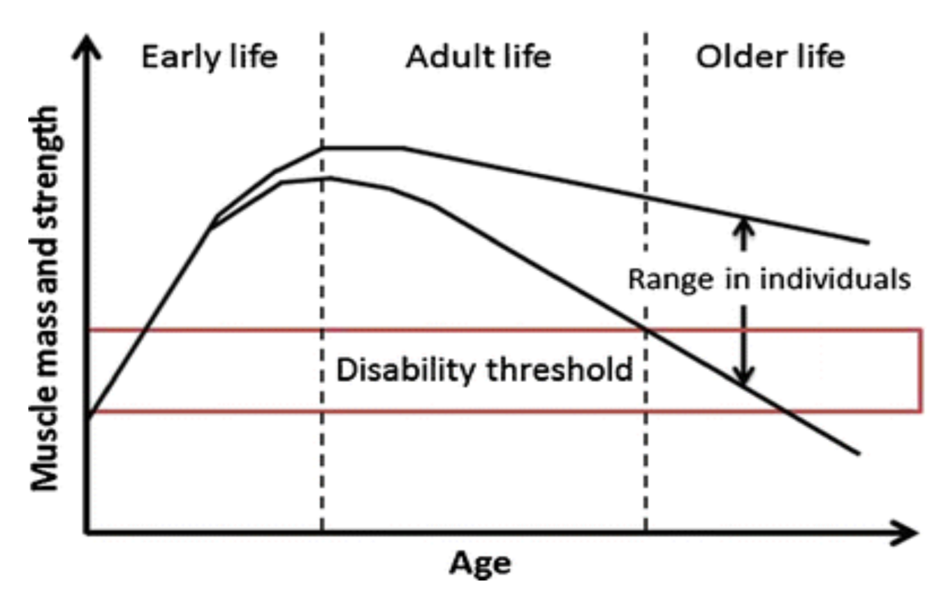 skeletal muscle mass is the second most variable component within and between individuals after fat mass. It stays relatively stable within individuals during younger adult years up to to ~30, after which this mass begins to decrease (and fat mass increase).