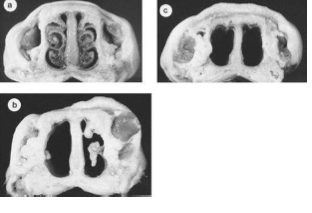 Note on image: KNOW THESE IMAGES. B and C show pig after infection when there has been erosion of nasal turbinates