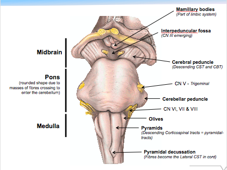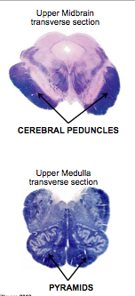 • Cerebral peduncles- part of the brainstem that link the midbrain to the thalami and therefore the cerebrum. Descending tracts from both corticospinal and corticobulbar tracts.