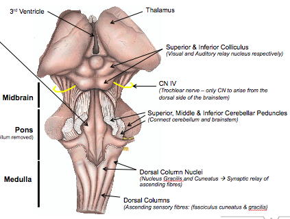 * CN IV motor nucleus lies in medial lower midbrain, CN IV exits the midbrain on the dorsal side. Its nerve decussates before leaving the midbrain. * Therefore L CN IV nucleus projects to the right eye, R CN IV nucleus projects to the left eye. * Damage to CN IV nuclues leads to loss of superior oblique function. Loss of ability to adduct eye. * Diploplia when reading/ descending stairs, head tilted towards the site of damage nucleus. * (Also be aware in lower midbrain lesion CN V sensory nucleus there- again proprioception likely affected).