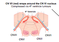 • CN VII nucleus starts laterally compared to CN VI nucleus, but to get out of the brainstem CN VII fibres wrap around CN VI nucleus before it exits anteriorly.