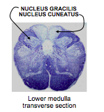 • At the level of this cross section see the two nuclei where the dorsal column 1st order neurones synapse with 2nd order neurons.