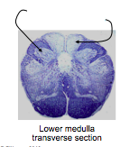 • Pyramids- formed from the corticospinal tract, 80-90% of which becomes the lateral corticospinal tract at the pyramidal decussation point and descends to innervate skeletal muscles on the contralateral side of the body.
