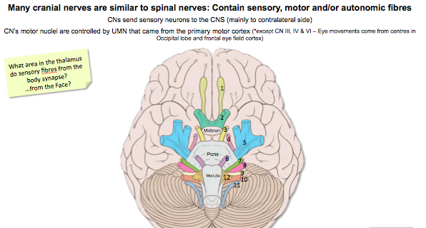 • Cranial nerves are very similar to spinal nerves: they carry sensory, motor and/ or autonomic fibres