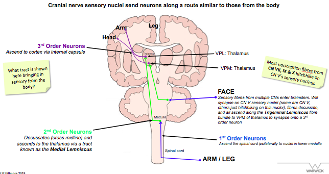 * Trigeminal nucleus is a large sensory nucleus that spans the length of the entire brainstem * Split into three parts that detect different sensory modalities: * 1) mesencephalic nucleus (superior- midbrain)- detects proprioception * 2) Principal nucleus (middle- Pons)) - detects Touch * 3) Spinal nucleus (inferior- medulla) - detects pain and temperature * 1st order neuron enters brainstem and synapses with 2nd order neurones in the appropriate part of the CN V nucleus before decussating and ascending to the VPM of the thalamus * Pathway from CN V nucleus to VPM is called the Trigeminal lemniscus. 2nd order trigeminal neurones cross over at different levels but ascend as trigeminal lemniscus.