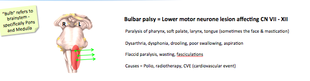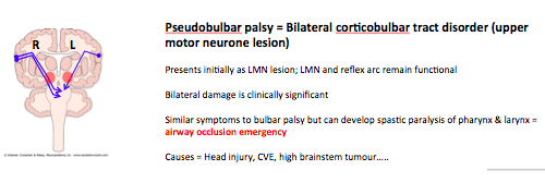 Pseudobulbar palsy = bilateral upper motor neurone lesion affecting corticobulbar tracts and UMN innervation to motor nuclei of CN’S: V , VII, IX, X, XI, XII.