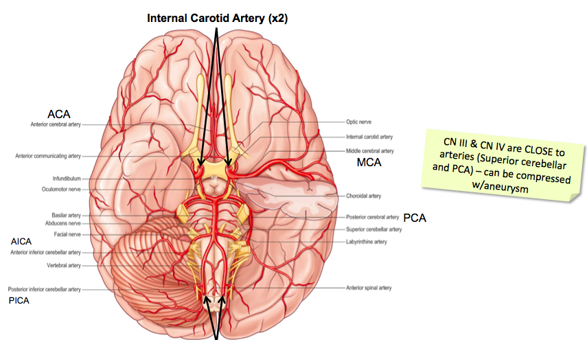 • Aneurysm in either of these arteries can compress and damage these cranial nerves leading to cranial nerve palsy.