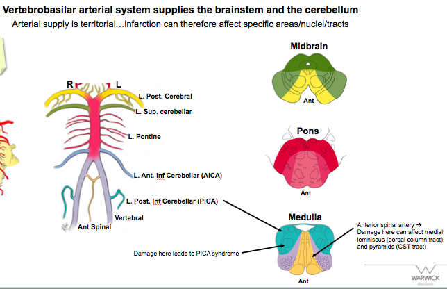 * The vertebrobasilar system supplies the cerebellum and brainstem * Vertebrobasilar system formed by the union of the two vertebral arteries which arise directly off the subclavian vessels and travel up the cervical vertebra in the foramen transversarium. * They enter the brain via the foramen magnum. * They unite over the pons, becoming the basilar artery which gives off small pontine arteries- supplying the pons. * Basilar artery then splits off giving two superior cerebellar arteries and the posterior cerebral artery. These arteries supply the midbrain. * The two vertebral arteries also give off the posterior inferior cerebellar artery, the anterior spinal artery (formed by union of vessels off the two vertebral arteries) and the anterior inferior cerebellar artery. * Anterior spinal artery runs over and supplies anterior median fissue of spinal cord. Also supplies the anterior medial portion of the medulla. * The posterior inferior cerebellar artery supplies the posterolateral aspect of the medulla. * The vertebral arteries themselves supply the antero-lateral portion of the medulla.