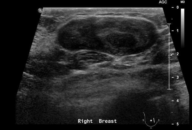 (Tubular adenoma would also be on the differential for this US appearance, but higher density on mammo)