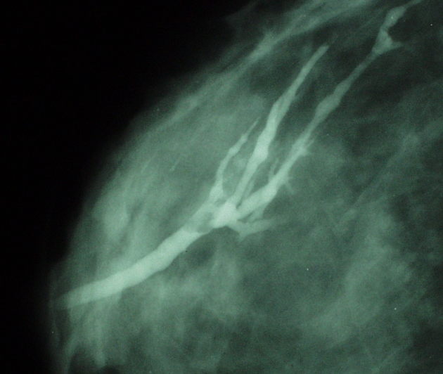 Galactogram. Filling defect within a duct, described by location: central (70-90%) or peripheral.