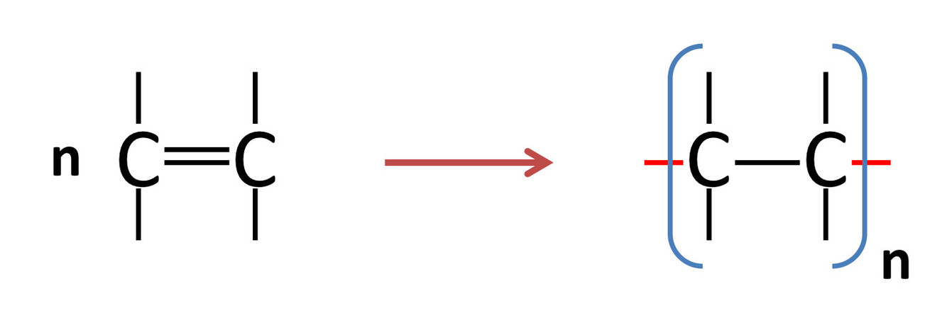 During addition polymerisation, many alkene monomers bond together to form a long chain - the polymer. The double covalent bond between the 2 carbons in the alkene molecule “open up” and are replaced by 2 single covalent bonds. In this way, thousands of molecules join together. A “backbone” of carbon atoms is formed along the centre of the polymer. There is only 1 product, the addition polymer. The addition polymer is made up of many repeating units of the monomer.
