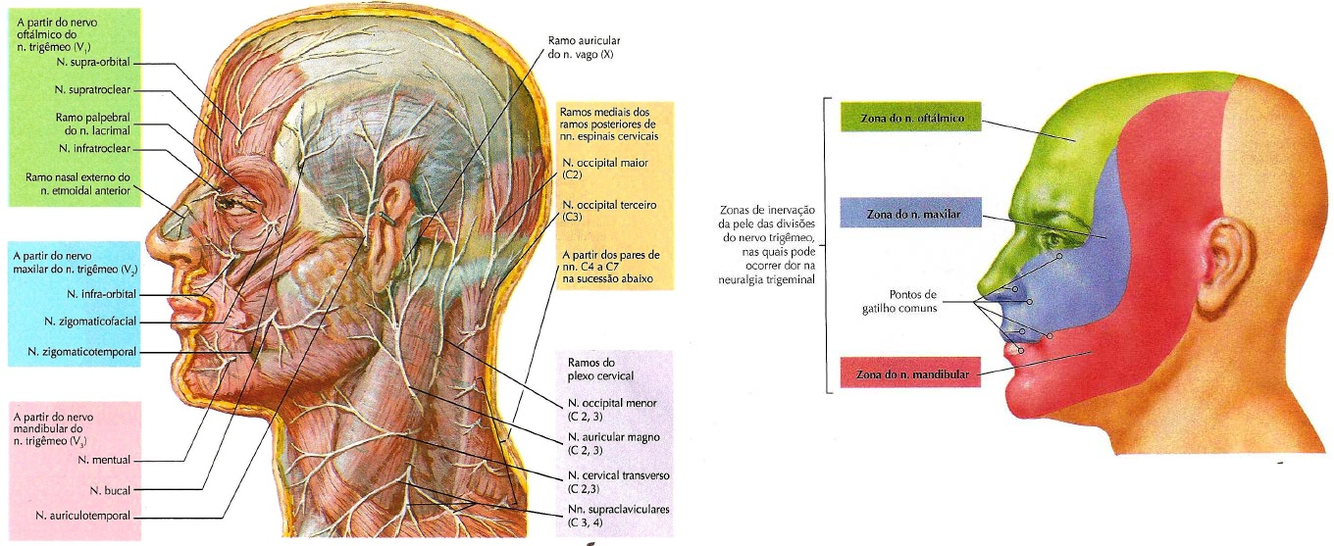 Principais ramos cutâneos que saem dos 3 ramos do trigêmino: