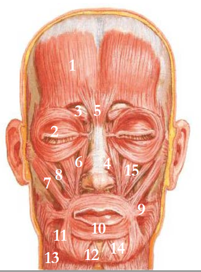 1-Ventre Frontal do M. occiptofrontal 2-Orbicular do olho: orbital, palpebral e lacrimal. 3-Corrugador do supercílio 4-Nasal: parte transversa e alar 5-Prócero 6-Levantador do Lábio Superior e da asa do nariz 7-Zigomático Maior 8-Zigomático Menor 9-Risório 10-Orbicular da boca 11-Abaixador do ângulo da boca 12-Mentual 13-Platisma 14-Abaixador do lábio inferior 15 -Levantador do lábio superior 16-Bucinador NERVO FACIAL