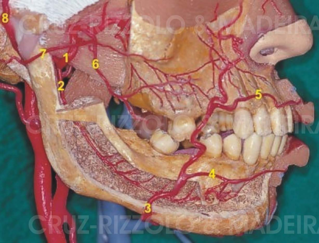 2-A. Labial Inferior 3-A. Labial Superior 4-A. Ramo nasal lateral 5-A. Angular (anastomosa-se com o ramo nasal dorsal e palpebral da a.oftálmica)