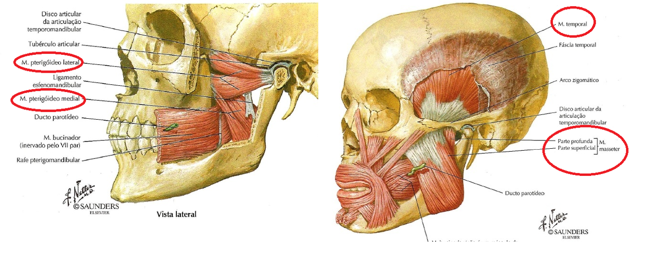 • Temporal • Masseter • Pterigóideo Lateral • Pterigóideo Medial Inervação: Raiz Motora do NC V via N. Mandibular