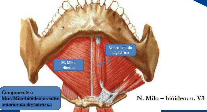1-Mm. Milo-hióideo- ramo milo-hióideo do n. alveolar inferior (ramo do V3). 2-Ventre anterior do digástrico. -Ventre anterior: ramo milo-hioideo do n. alveolar inferior (ramo do V3); Ventre posterior: n. facial. 3-M. gênio-hióideo- n. hipoglosso 4-M. genioglosso.-n. hipoglosso