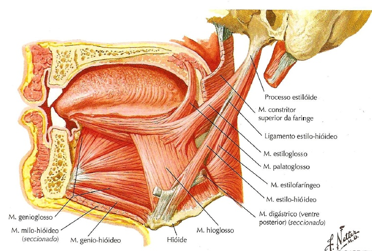 1-Mm. Milo-hióideo 2-Ventre anterior do digástrico. 3-M. gênio-hióideo 4-M. genioglosso.
